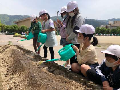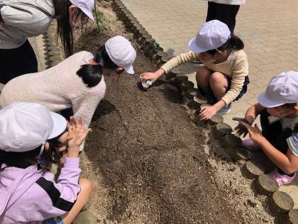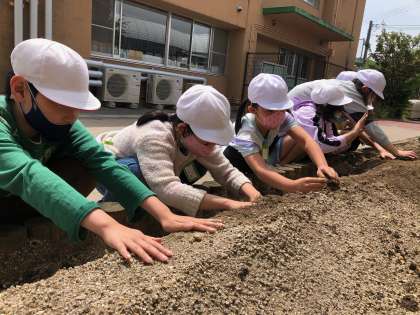 畑の学習では,オクラとベビーリーフの種をまきました。友だちと協力してお水をあげたり,土をふかふかにしたりしました。「はやく芽がでるといいな」「がんばってね」といった素敵な声が聞こえてきました。