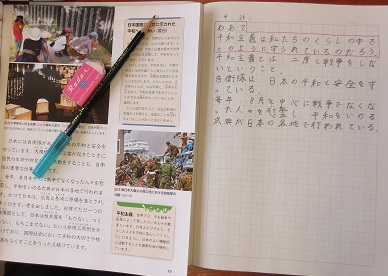 6年生日本国憲法について学習をしています。今日は「平和主義は私たちのくらしの中でどのように守られているのだろう」というめあてについて自分が考えたことを発表し合いました。
