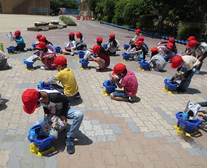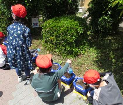 植木ばちに土や肥料を入れ,指で穴をあけて種を5個まきました。最後に水をたっぷりかけました。