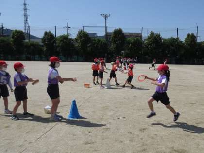 2チーム対抗の折り返しリレーをしました。大回りにならないように気を付けながらコーンを回り,リングバトンを引き継ぎます。