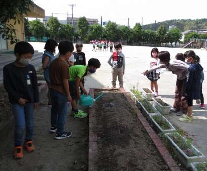 前の理科の時間に畑やプランターにヒマワリとホウセンカの種をまきました。今日は,様子を観察したり,水やりをしたりしました。