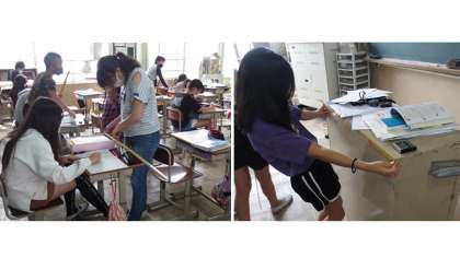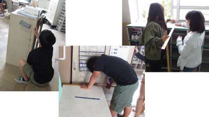 立方体や直方体の体積の求め方を学習した5年生。今日は身の回りのものの縦・横・高さを測って体積を計算しました。お道具箱やロッカー,給食台などの体積がわかりましたね。