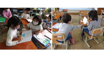 2年生は来週一緒に行う「学校たんけん」の招待状を渡してくれました。そして1年生が色を塗るのを見守ったり,折り紙を教えてくれたりしました。来週の学校たんけんも楽しみですね。