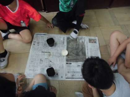 今日は,先日観察をしたツルレイシの種をポットに撒く活動をしました。あいにくの天気で,外での活動ではなく,中学年多目的室で新聞紙を敷いての活動になりました。どの子ども達も主体的に,ペアになった友達と声を掛け合いながら,種を撒くことができました。いつ芽が出てくるのでしょうか。発芽するのが楽しみです。