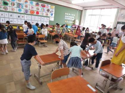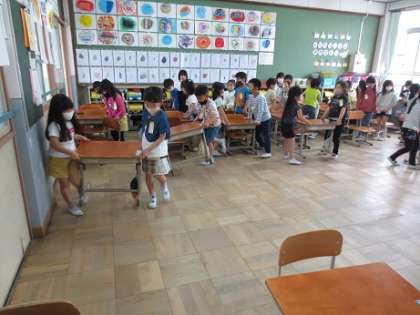 最近は1年生も机運びのお手伝いをするようになりました。