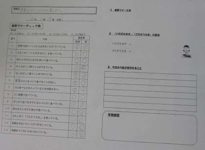 栄養教諭の先生と一緒に「食事のマナー」について考えました。「食事マナーチェック」をした後,どうして食事マナーが大切なのかを話し合いました。