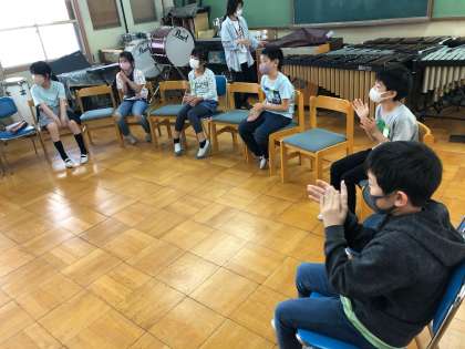 音楽室で「大きな古時計」の合奏をしました。友だちの音を感じながら,自分のパートを一生懸命取り組んでいる姿がみられました。授業の最後には,一人ひとり考えた今日のめあてをふりかえって発表し合いました。