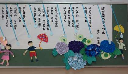 中央玄関には「ぱぴぷぺぽっつん」という詩と内容に合わせた飾りが掲示されています。