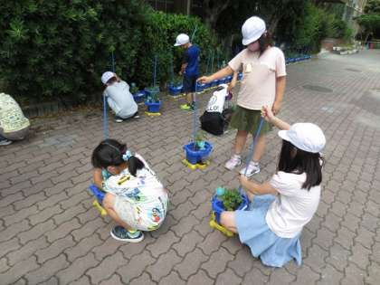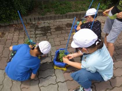 育てているミニトマトが成長してきました。「緑色の実がなってる!」「花が咲いているよ!」と,自分のトマトの変化に気づいて喜ぶ子どもたち。