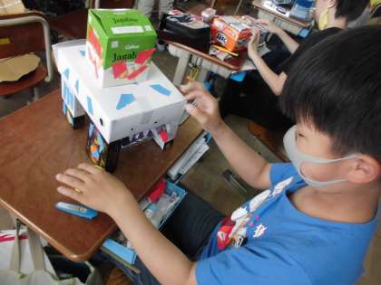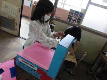 お家でご協力いただき集めていただいた箱を使って,入れ物作りを進めています。