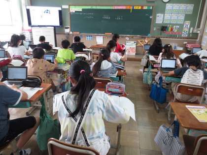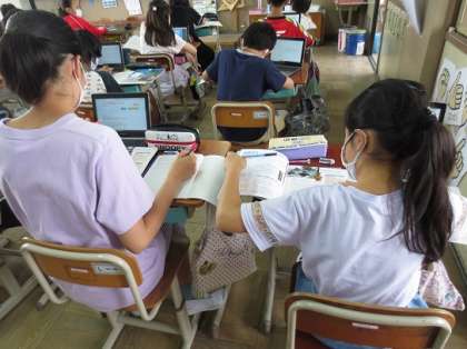「国土がどのように統一されていったのか」を「ワカタケル」「大和朝廷」「渡来人」のキーワードを中心に,タブレットで調べてノートにまとめたものを交流しました。