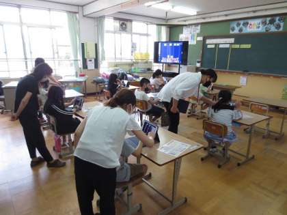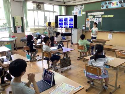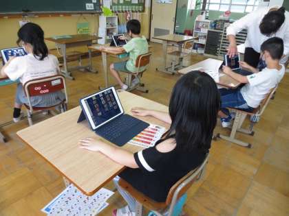 タブレットを使ってごみの分別の予想をしたり,友だちの考えを共有したりしました。また,一軒あたりどのくらいの量のごみが出ているのかをグラフをみて知ることができました。授業の最後には,ごみのゆくえについて3つのチームに分かれて調べ学習に入りました。