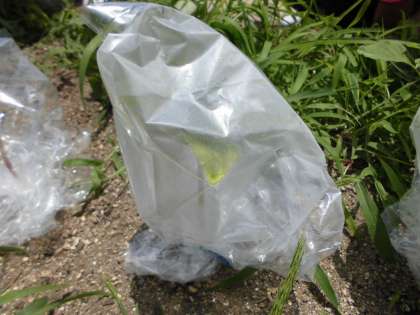 根から吸い上げた水はどうなるのかな?・・・ということで,葉から出るのではないかと予想した子どもたち。どうやって確かめようかとみんなで考えて,袋をかぶせることにしました。