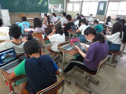 琵琶湖に暮らす生き物をタブレットで調べて下絵を描いている人が多かったです。