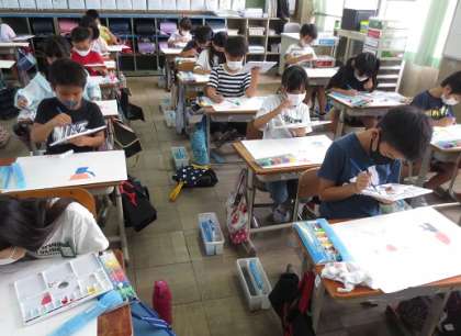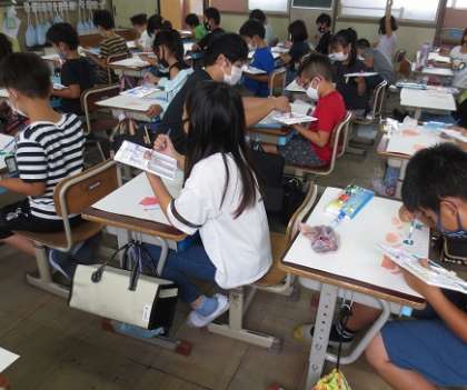 「ふしぎなコウモリガサ」というお話を聞いて,絵を描いています。
