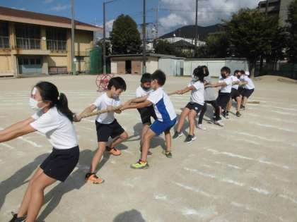 綱引きの練習では,入退場の仕方を確認し,最後には実際にゲームを行いました。先生の掛け声で後ろに引っ張ったり,腰を下ろして重心を低くしたりしました。