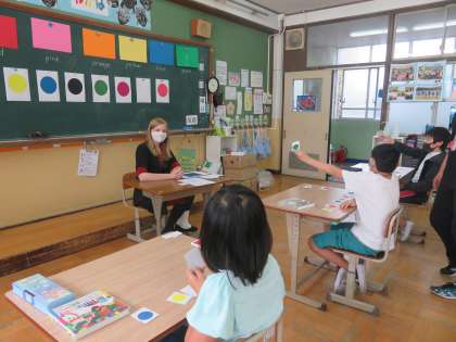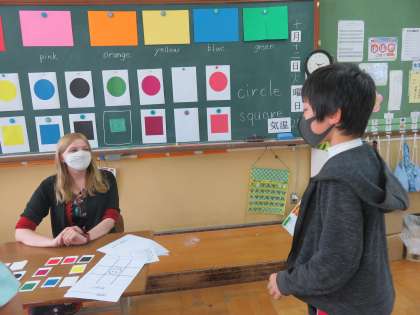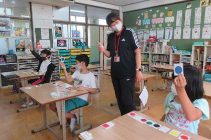「red」「yellow」「green」など,色の言い方を練習しました。そのあと,〇「circle」と□「square」の言い方に触れ,カードを使ってゲームをしました。また,習ったことを使って最後にビンゴもしました。楽しく英語に触れることができました。