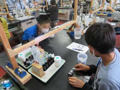 今日は,「発見!電池のふしぎ」「小さな珪藻(けいそう)の大きな役割」の実験をしました。