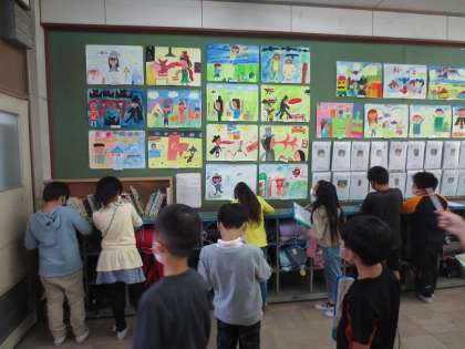 図工の時間に「お話の絵」の鑑賞をしました。1組と2組が一緒に行ったので,どちらのクラスの友達の作品も鑑賞することができます。