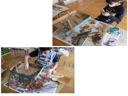 秋みつけで拾ってきたどんぐりや落ち葉,枝などを使っておもちゃ作りをしました。「どんぐりバトルゲーム」や「釣り」,「どんぐりシーソー」など色々なおもちゃを作っていました。来週にある秋祭りに向けて,子どもたちは頑張って完成を目指しています!