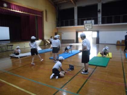 子どもたち同士で声を掛け合う姿も多く見られています。マット運動は個人技ですが,自分ひとりだけで進めている学習ではないことを実感していってもらいたいと思います。