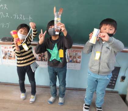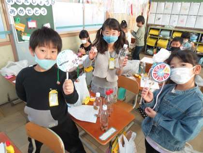 勧修寺公園で拾ってきたどんぐりや落ち葉を使っておもちゃを作りました。「でんでんだいこ」や「マラカス」「けん玉」「ボーリング」などを工夫して作りました。作るのも遊ぶのも楽しそうでした。