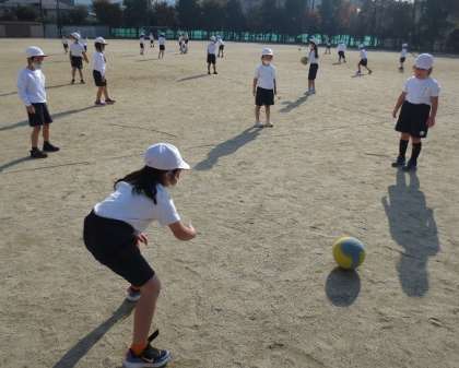 「ころがしドッジボール」の学習が始まりました。ころがしドッジボールは,ボールを転がしてコート内の相手チームの人に当てるゲームです。今日はチームの友達とボールを転がしたり受け取ったりする練習をしました。