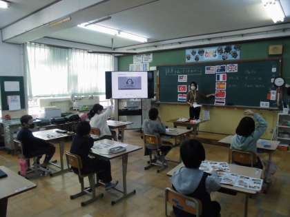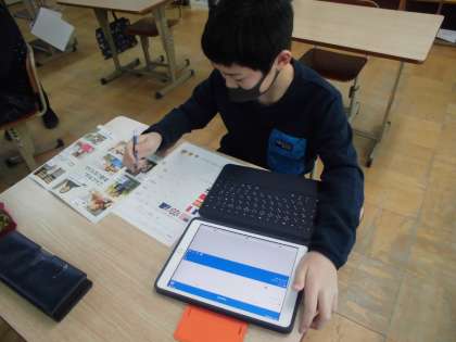 タブレットの翻訳機を使って世界の国のあいさつを知ることができました。初めてタブレットの翻訳機を使っての学習でしたが,発音をまねして言ってみたり,言葉の意味を知ったりと楽しく学習することができました。「今度この国に行ってみたい」や「タイ語のこんにちはってこんな風に書くんだ」など,思ったことを授業の最後に発表していました。