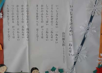 中央玄関の掲示物が晩秋バージョンに変わりました。今年も残すところ1か月余りになったのだなとしみじみ感じます。谷川俊太郎さんの素敵な詩も掲示されています。子どもたちにもぜひじっくりと読んでほしいです。