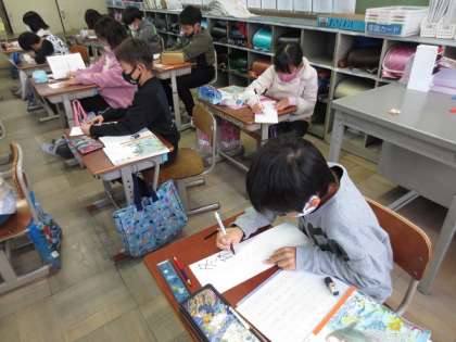 生活の中で冬らしさを感じる言葉をノートに書きました。そして,たくさん見つけた冬の言葉を使って俳句を作りました。俳句ができた人から先生に見てもらって,ペンでなぞっていきました。