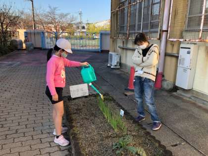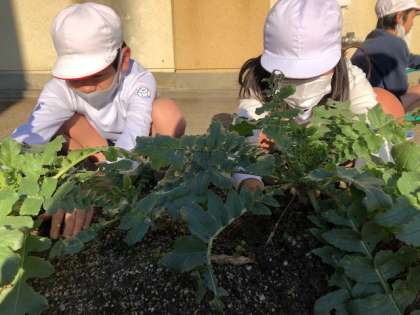 朝の走りをした後に,水やりをしました。暑い日も寒い日も毎日忘れず水やりをし,大切に育てている野菜が大きくなりました。大根が寒くならないように土をかぶせていました。また,「大きくなあれ!」「美味しくなあれ!」と野菜に言いながら水やりをしている姿がとてもすてきでした。