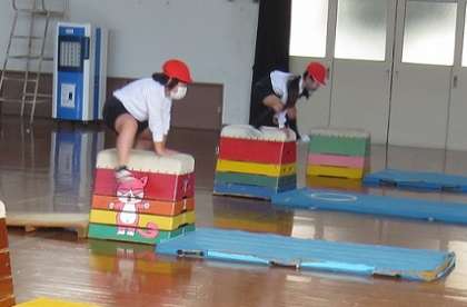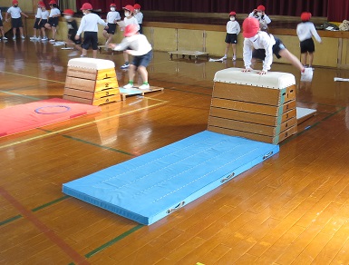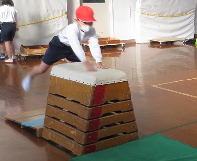 2年生は体育の時間に「とびばこあそび」の学習をしています。自分が挑戦したい高さや向きの跳び箱を選んで開脚跳びの練習をします。いろいろな跳び箱をどんどん跳んで,たくさん練習することができました。