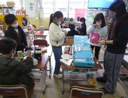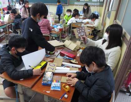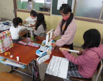 空き箱や空容器,空き缶,ペットボトルのふたなど,家庭から出る廃材を集めたり組合せたりしてあそびを作りました。1年生を招待して遊んでもらうための準備として,遊びやルール紹介のポスターを作りました。1年生は楽しく遊んでくれるかな。