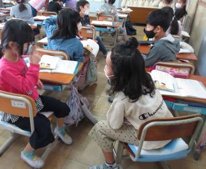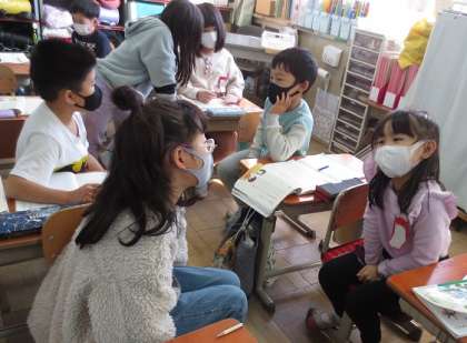 今日は「いま一番楽しいこと」を聞き合いました。「鉄棒です。」と答えた友達には「どんな技ができるんですか。」「どうやってできるようになったんですか。」など,友達のことをにたくさん伝えられるように質問をしていました。