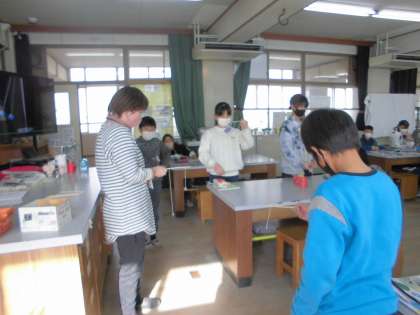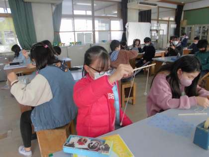 「ふりこの動き」で学習したことを生かして,「念力ふりこ」に挑戦しました。長さの違うふりこを棒につけて,念力を送ると・・・あら不思議!念じた方のふりこが揺れ始めました。演技力も必要になってきますが,どの子も真剣に練習する姿が見られました。