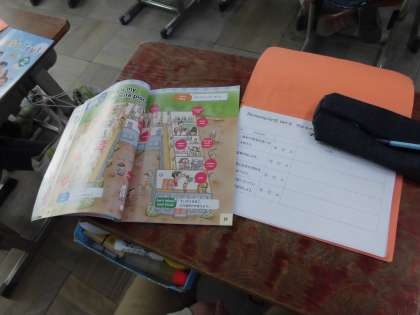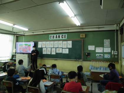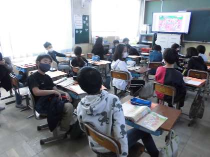 日常で聞いたことのある単語から教科や教室名を想像する子ども達,先生が正しい発音で単語を言うと,しっかりと繰り返し発音し,意欲的に覚えようとする気持ちが伝わってきました。