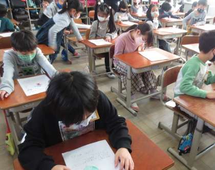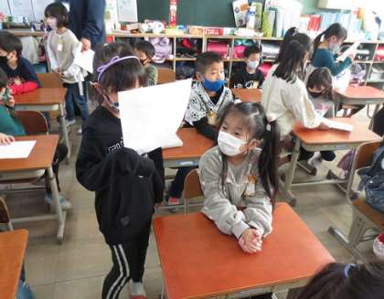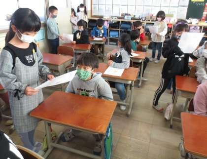 昨日「わくわくあそび大会」に招待した1年生からお礼の手紙が届きました。1年生が2年生の教室に来て,手紙を読んで渡してくれました。