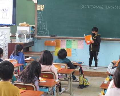冬休みに家の人がにこにこになるためにしたことのスピーチをしました。「お母さんがにこにこになるように,お皿を運ぶお手伝いをしました」「落とさないように両手で持って歩きました」のように,お手伝いの様子を伝えました。