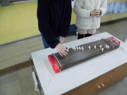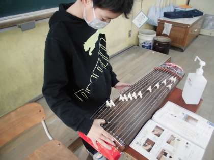 また,学習用の小さい箏が1台あるので,順番に,弾いてみたい子どもが角爪をつけて弾いてみました。