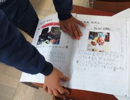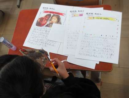 おうちの方に教えてもらった幼いころのエピソードをまとめて,自分の成長を振り返るアルバムを作っています。