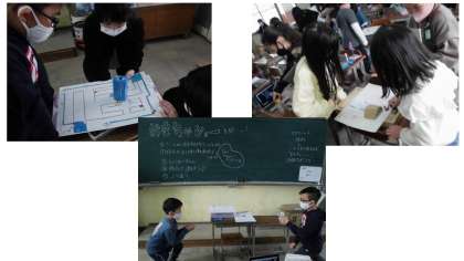 動画で説明してもらった遊び方で遊びます。「おもしろいーー!」「このデザイン,いいね〜」などと声を掛け合いながら楽しく遊ぶことができました。また,同じ班以外の友達にもプレゼン動画を送り,たくさんの作品を楽しむことができました。