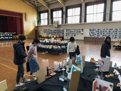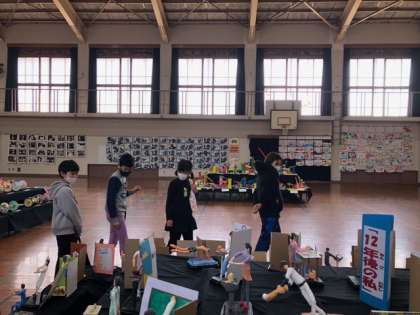 図工展でかざられている1年生から6年生までの作品を鑑賞しました。子どもたちは,「この作品とってもかわいい」「来年は私もこんなの作るのかな」「やっぱり6年生の作品すごい」など,たくさんのすてきな作品に出会うことができました。