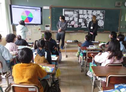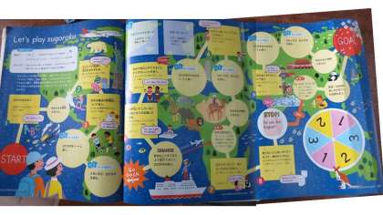 ALTの先生と一緒に英語すごろくをしました。ルーレットが止まった数だけコマを進め,「左どなりの友達に誕生日をたずねる」「好きな曜日の時間割について言う」などのミッションを英語で行いました。