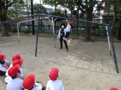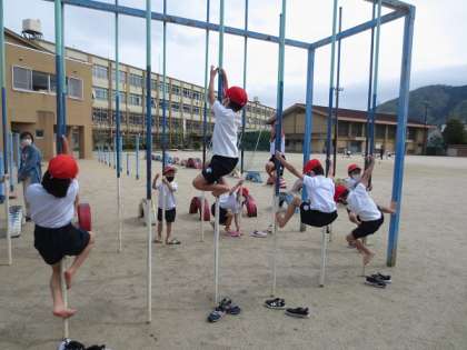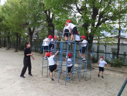 「ジャングルジム」「のぼり棒」「うんてい」の3つのグループに分かれて遊具遊びをしました。安全に遊ぶために親指を回して遊具を握ることに気を付けました。