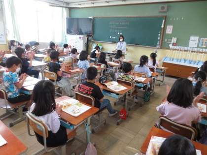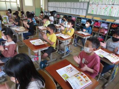BINGO(ビー・アイ・エヌ・ジー・オー)のところは手をたたきながら歌いますが,先生の指示で,「ビーだけ手をたたく」ときがあったり,「ビーとオーだけ手をたたく」ときがあったりします。