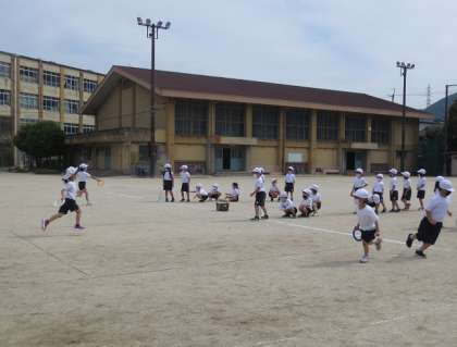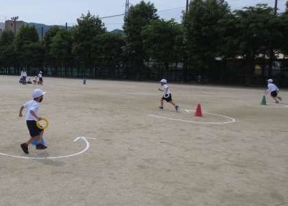 一生懸命走ってリングバトンをつなぎます。コーンの周りを小さく回るように頑張りました。