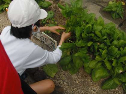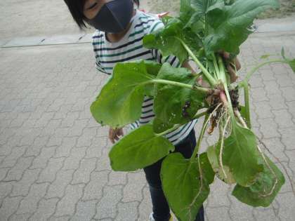 昨年度から育て続けているほうれん草。とっても大きくなったので収穫してお家の人へのお土産にすることにしました。大きなほうれん草を花束のようにかかえて大事そうに持ち返った子どもたちです。