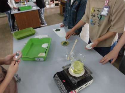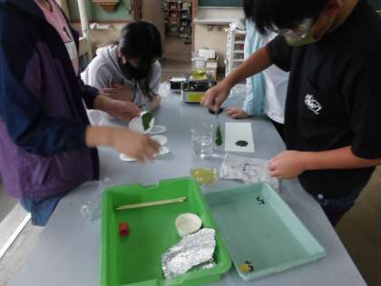 昨日,今日で『植物の葉に日光が当たると,葉にデンプンができるかどうか』の実験をしました。