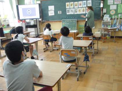 ALTの先生と英語の学習に取り組みました。月や日付け,曜日の英語の発音を教えてもらったあと,自分の誕生日を英語で紹介しました。よく聞いてしっかり発音することができました。