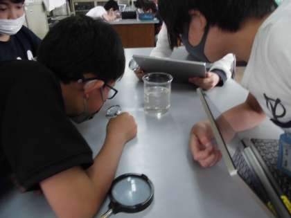 虫眼鏡やタブレットで撮影しながら,